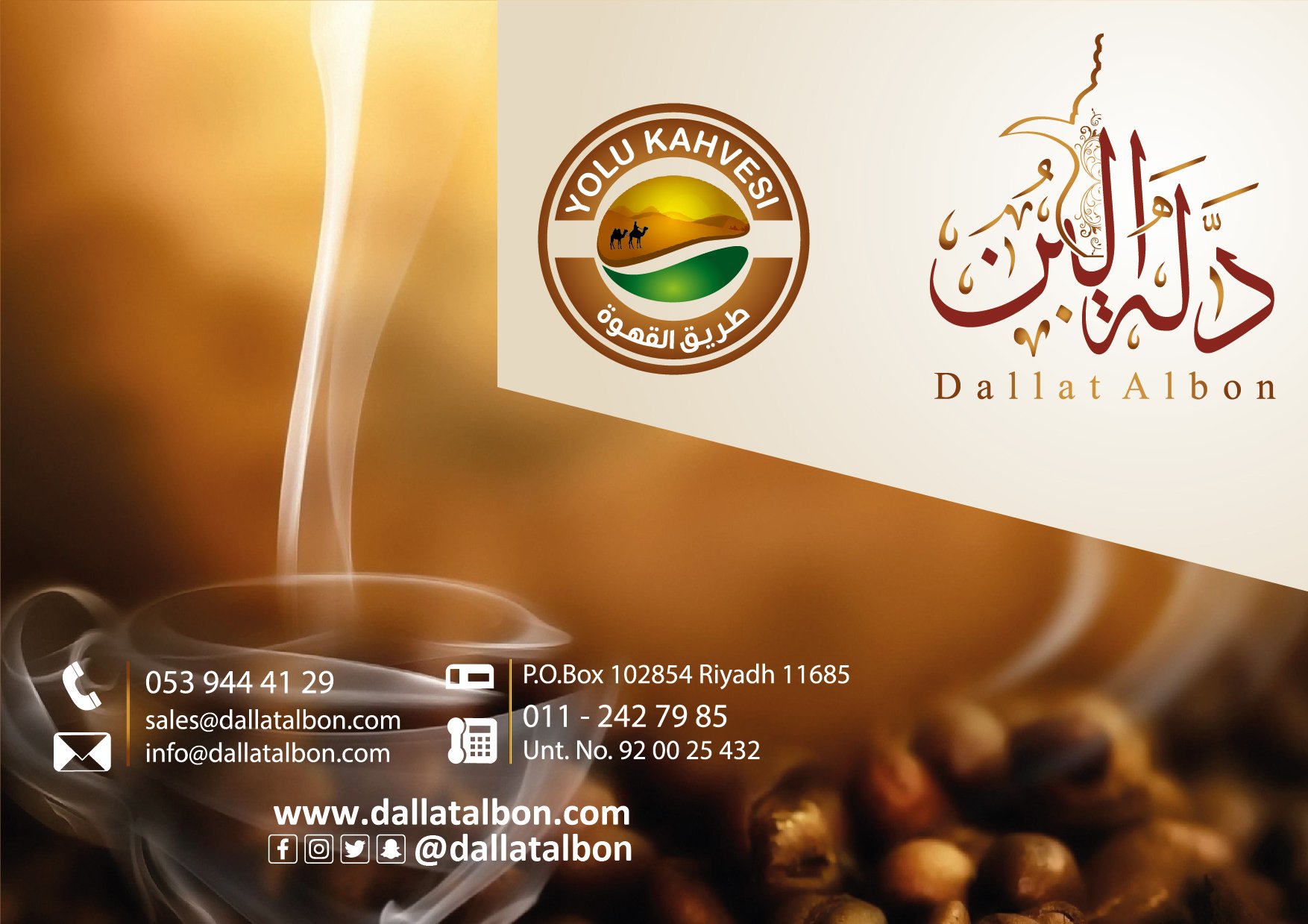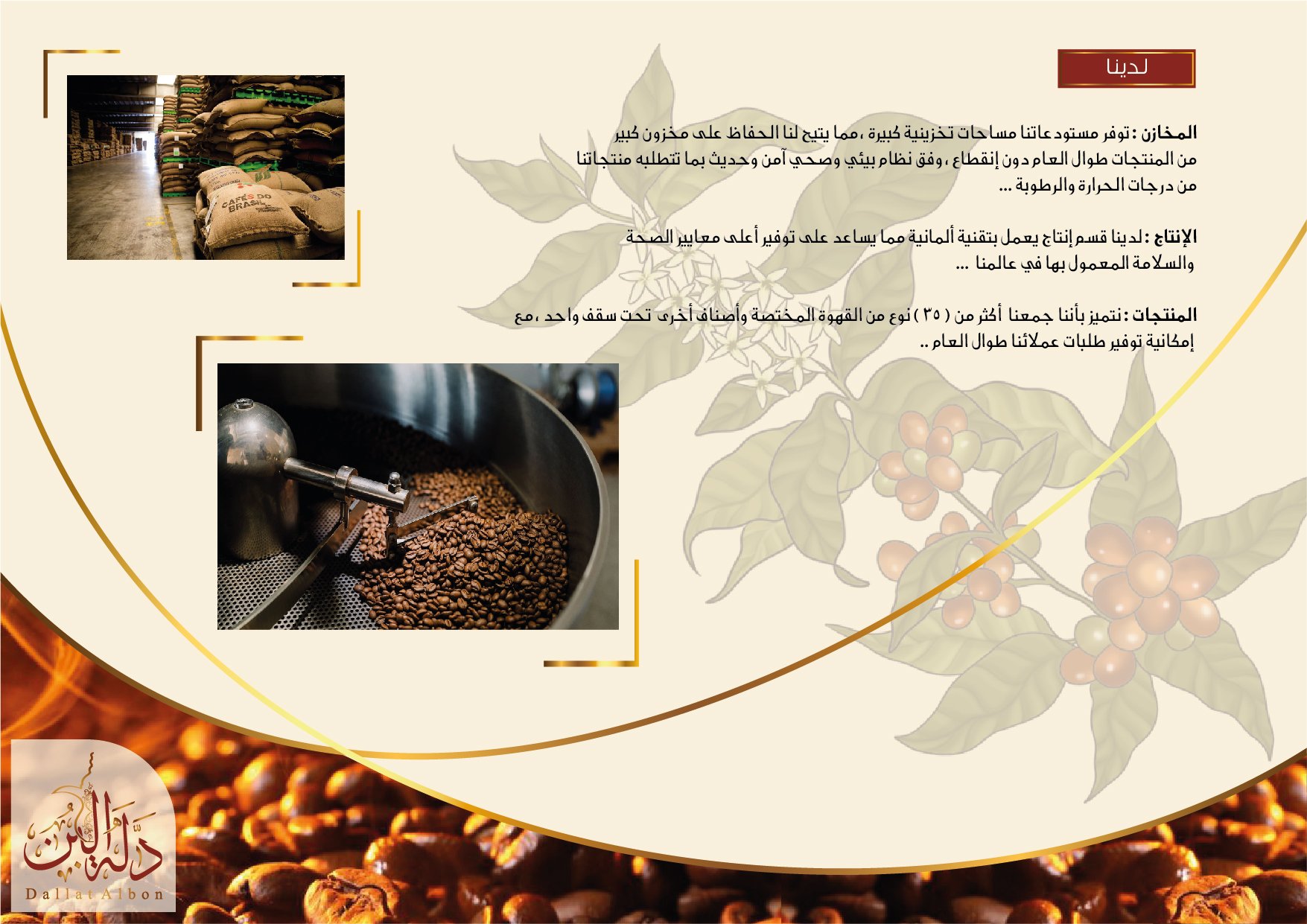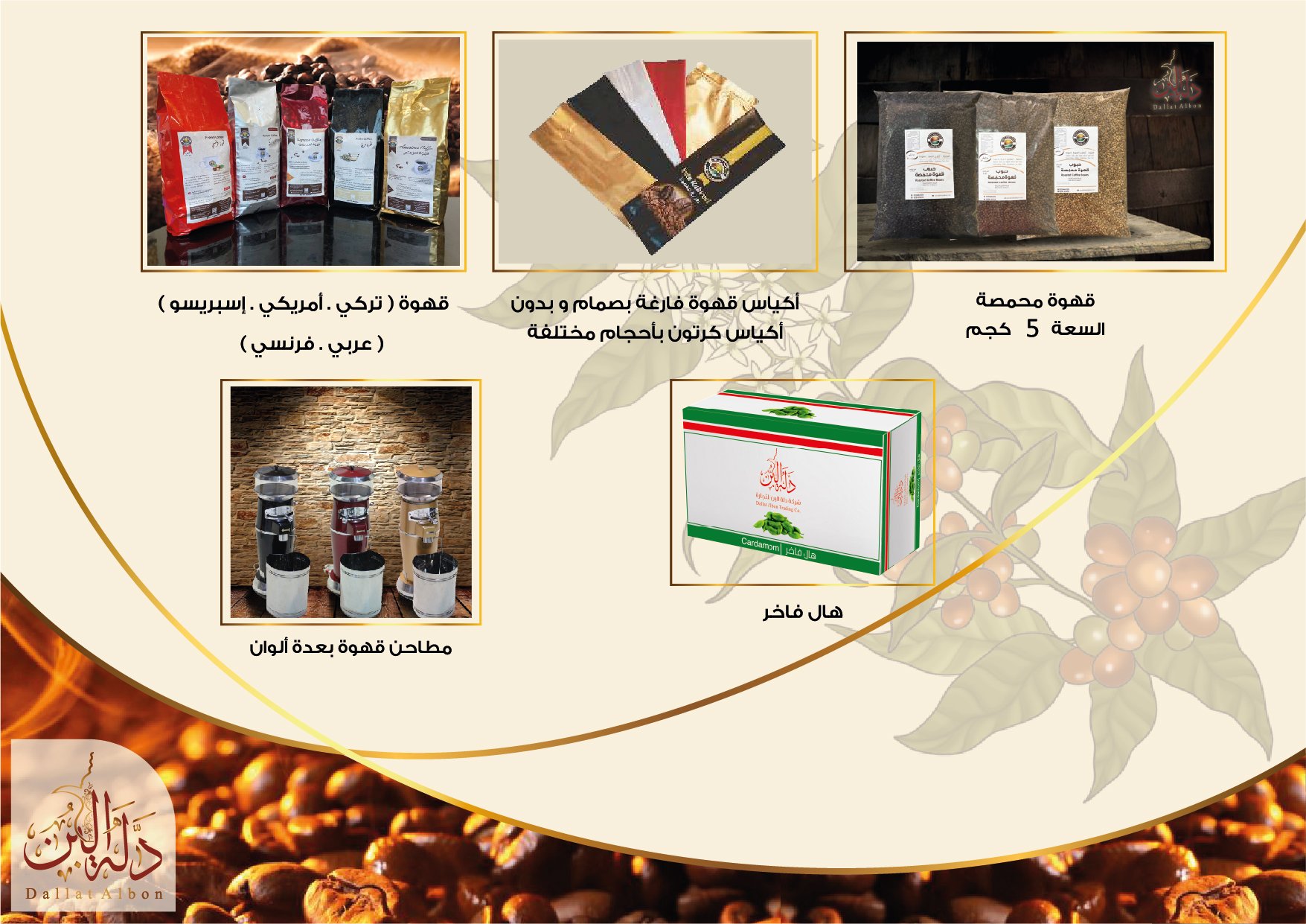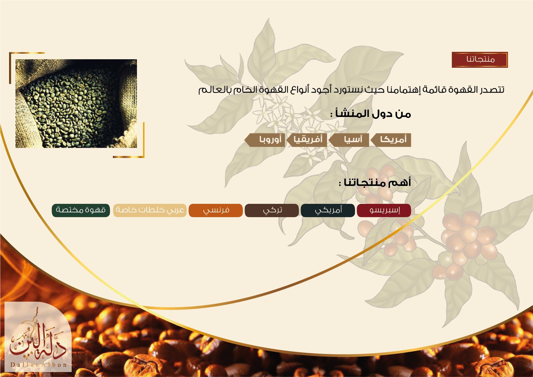 شركة دلة البن للقهوة: نقوم بإستيراد وتصدير وتجارة الجملة والتجزئة في المواد الغذائية وخاصة البن والهال والشاي. نستورد حوالي 30 نوعا من حبوب القهوة الخضراء. من بين دول المنشأ للبن (البرازيل – الهند – غواتيمالا – كولومبيا – إثيوبيا – أوروبا). تتصدر القهوة قائمتنا المثيرة للإهتمام حيث نقوم بإستيراد أجود أنواع القهوة الخام التي تعطي مذاقًا رائعًا عند تحميصها. تنتج شركة دلة البن العديد من أنواع القهوة الجاهزة مثل (إسبريسو – قهوة أمريكي – قهوة تركي -قهوة فرنسي -قهوة عربي مع خلطة خاصة). . لدينا خط إنتاج للمطاحن وآلات التحميص بجودة عالية، وقدرة على توفير قطع الغيار. تعتبر شركة دلة البن من أقوى مستوردي القهوة في المملكة العربية السعودية ونقوم بتسويق منتجاتنا في جميع أنحاء المملكة.