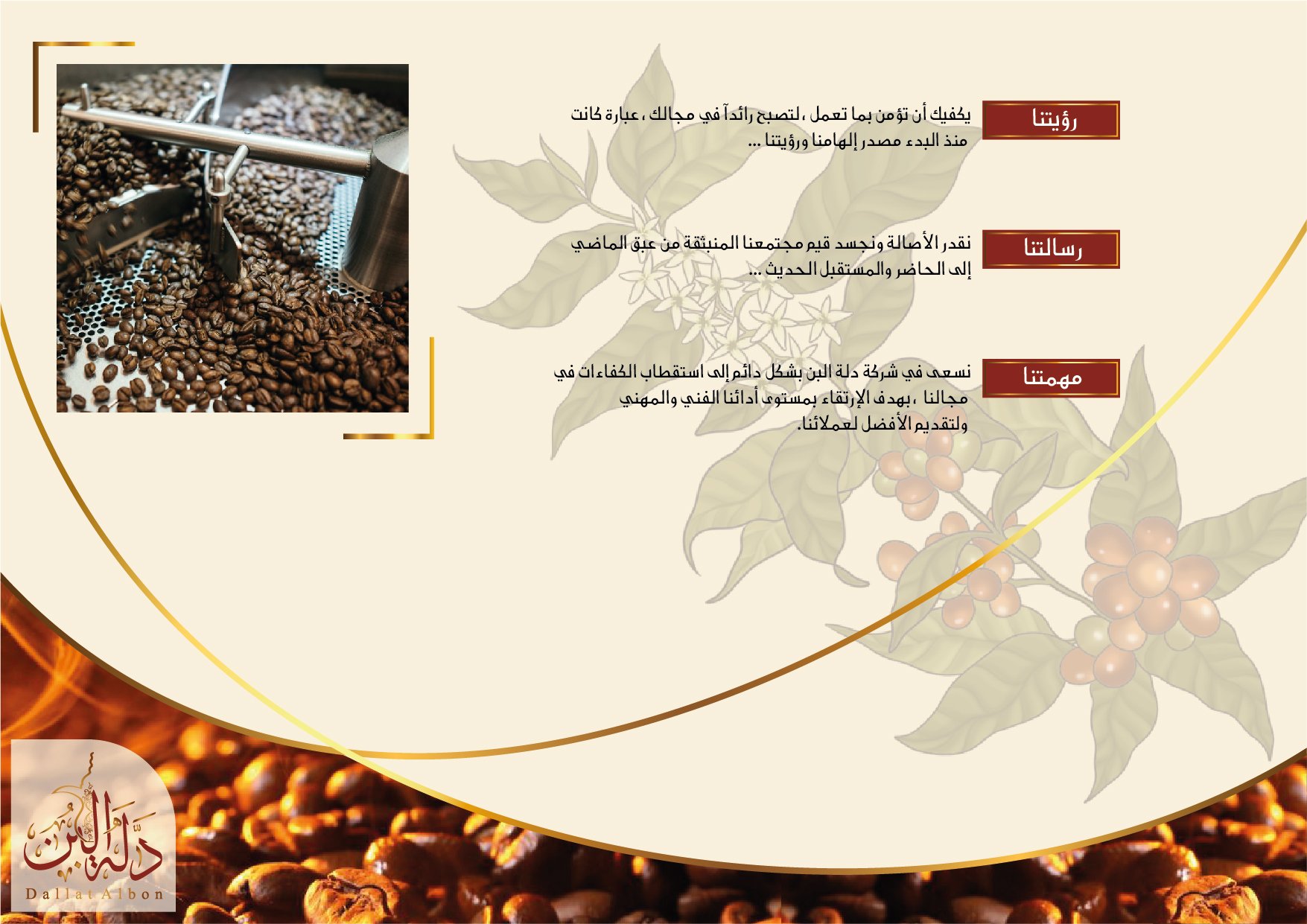- أن نكون شركة رائدة في مجال البن بجميع أنواعه من خلال إرضاء وتلبية احتياجات عملائنا.