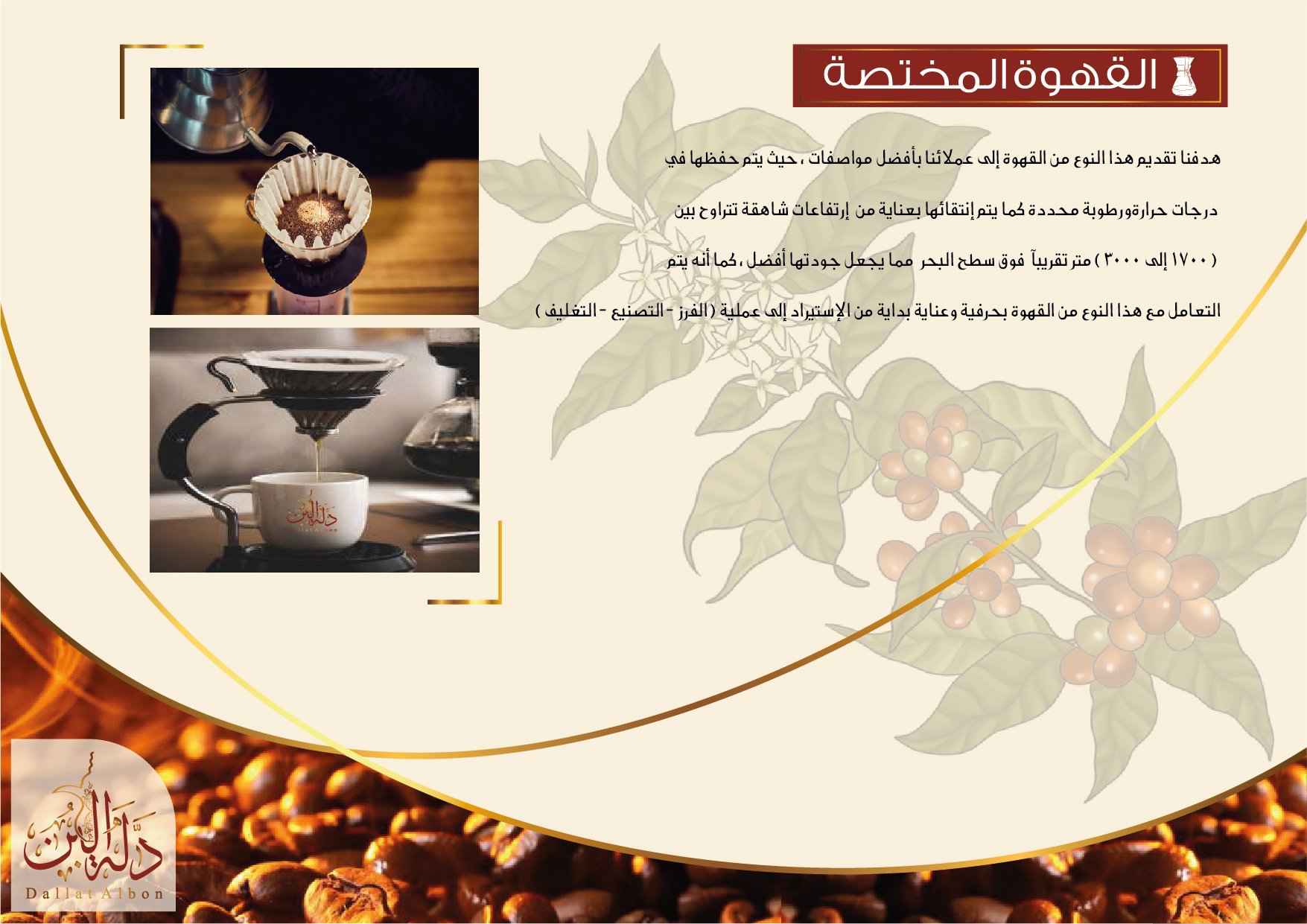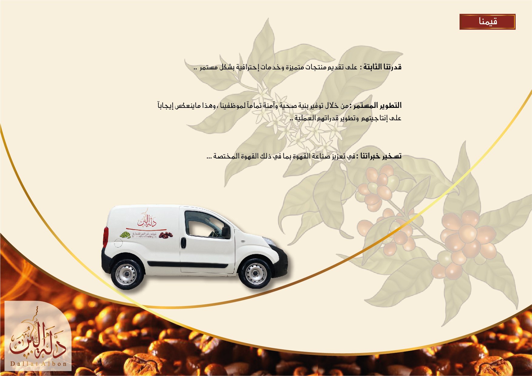 - الحرفية والتميز في إستيراد وتصنيع وتسويق جميع أنواع القهوة لتقديم منتجات ذات جودة عالية لعملائنا ، مدعومة بخلق علاقة قوية مع العملاء. البحث عن فرص للإستثمار في تجارة البن ،التطوير المستمرلمنتجاتنا، وخلق روابط الثقة من خلال إحترام العملاء والموظفين ، العمل على المحافظة وإستمرار عدم التغيير بالجودة. إختيار أجود وأفضل أنواع حبوب البن. بناء قاعدة عملاء داخل وخارج المملكة ، تعتمد على الثقة المتبادلة بيننا وبين عملائنا والعمل بإستمرار على الحفاظ على جودة منتجاتنا و مرونة التعامل والتنسيق بين إدارة المبيعات والعملاء بشكل إحترافي وأكثر إلتزاماً بشروط الجودة وخدمة ما بعد البيع.